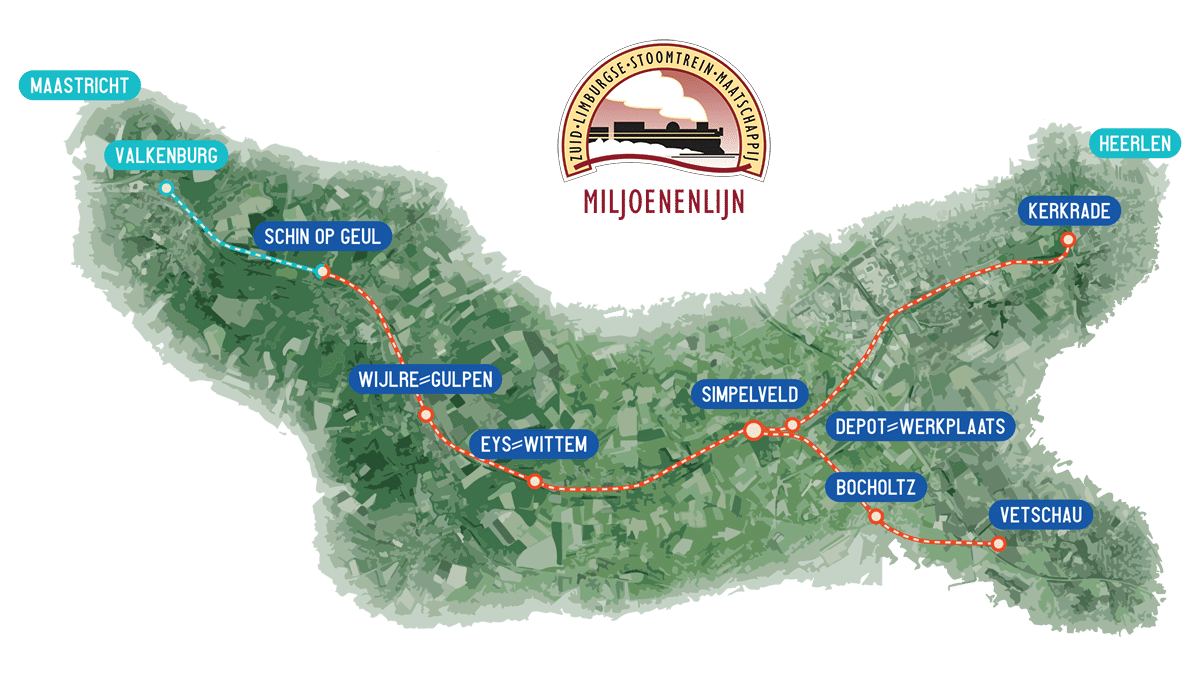 * De stoomtrein en railbus van de Miljoenenlijn rijden niet naar Station Valkenburg. Met je Miljoenenlijn-treinkaartje kun je in Schin op Geul gratis overstappen op de treinen en bussen van Arriva naar o.a. Station Valkenburg.
